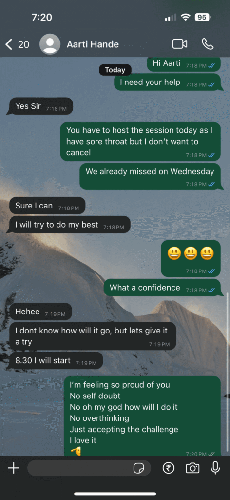 Today was a moment I’ll never forget. I got a sore throat in the evening and knew I couldn’t host my 8.30pm session. So, I sent a quick message to Aarti, one of our Conversation Club members from 8.30pm batch, asking if she could host the session today.